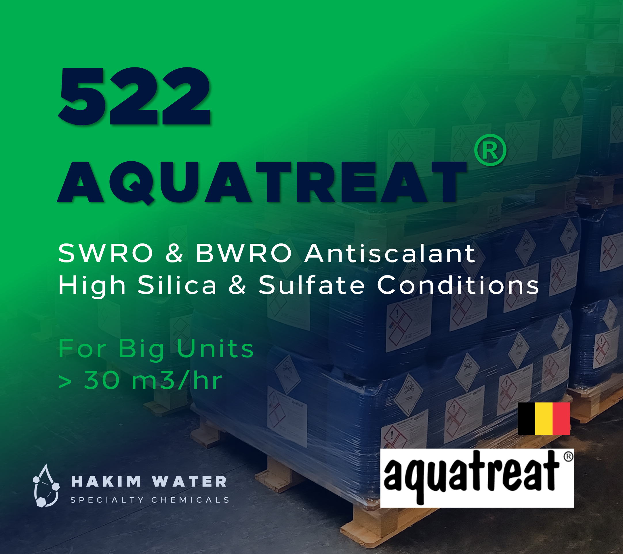 AQUATREAT 522 is a liquid, broad-spectrum antiscalant, used to prevent fouling and scaling in reverse osmosis and nanofiltration systems for brackish and sea water applications. AQUATREAT 522 is a super concentrated product based on a mixture of high-tech polymers and strong sequestrants that prevents and gradually removes organic and inorganic deposits, avoiding corrosion. AQUATREAT 522 does not contain wetting agents nor strong complexing agents such as NTA or EDTA (which can cause corrosion). AQUATREAT 522 is NSF/ANSI 60 certified and can be used for the production of drinking water at a maximum concentration of 10 mg/l on the feed water. AQUATREAT 522 can also be used to clean boilers, scrubbers or other systems where wetting agents must be avoided due to environmental reasons. Hakim Water C&E is the Exclusive Distributor of Aquatreat co bvba Products from Belgium in the Sultanate of Oman and MENA Region.