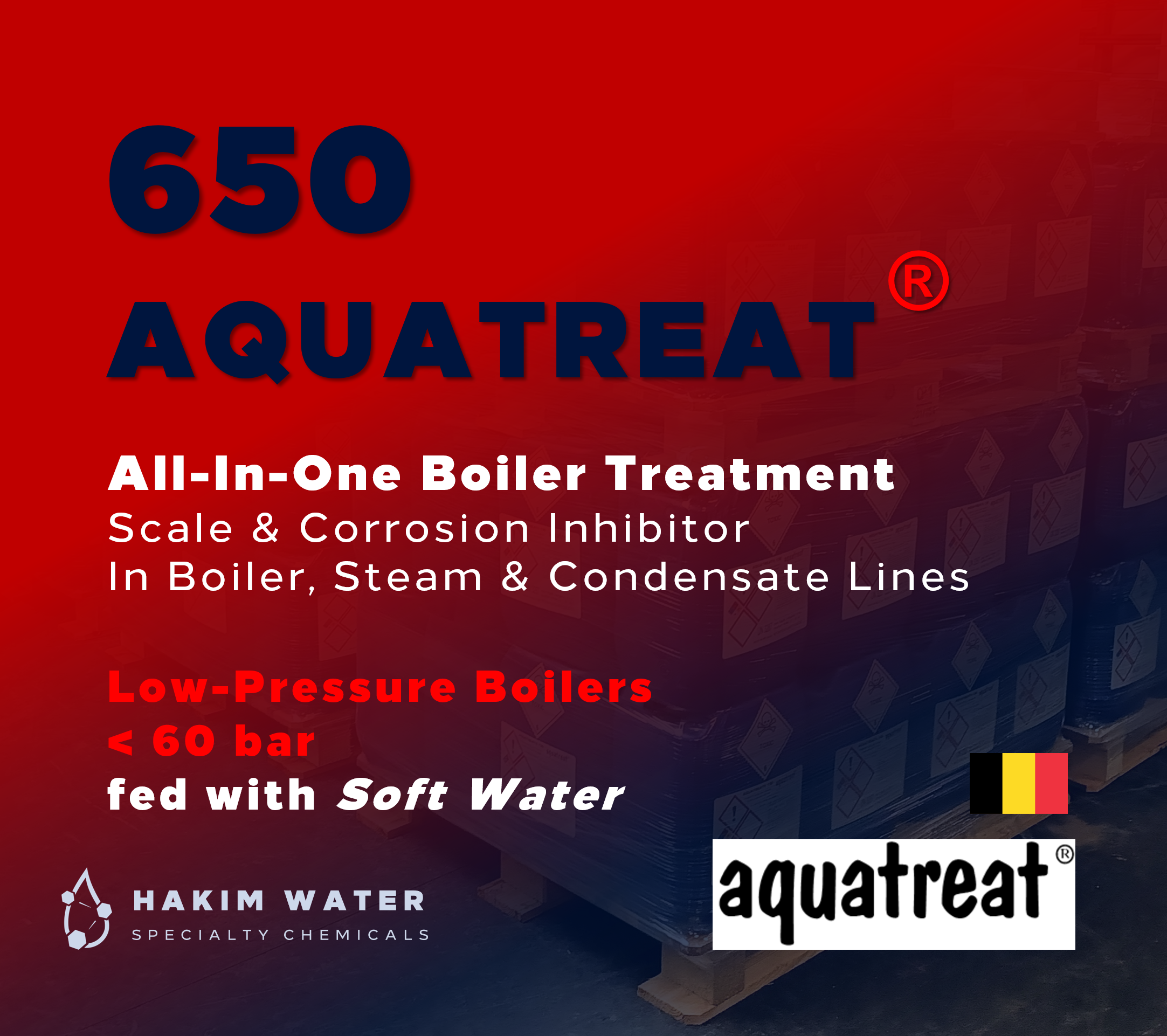 AQUATREAT 650 is an all-in-one liquid product developed to prevent corrosion and deposits in boilers until 60 bar. AQUATREAT 650 gradually removes existing deposits. AQUATREAT 650 protects the steam and condensate lines against corrosion. AQUATREAT 650 contains polyphosphates, dispersants, oxygen scavengers, neutralizing and volatile amines and an antifoam, complying with FDA 173.310. - AQUATREAT 650 is specially recommended for boilers operating with softened make-up water. Hakim Water C&E is the Exclusive Distributor of Aquatreat co bvba Products from Belgium in the Sultanate of Oman and MENA Region.